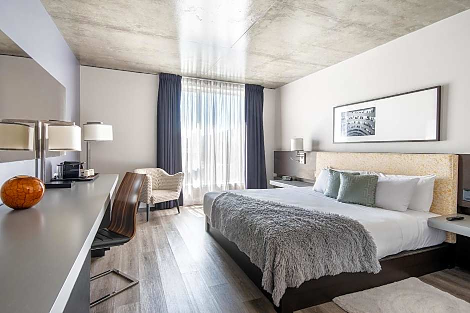 This contemporary room is equipped with a work desk, 55-inch flat-screen TV and free Wi-Fi. The bathroom features a glass walled-in shower.